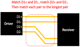 如果您有多個差分對攜帶并行數(shù)據(jù),則每個差分對都需要匹配,然后這些對必須彼此匹配。如下所示,其中單個驅動程序正在將并行數(shù)據(jù)發(fā)送到單個接收器。這樣可確保每個差分對都能充分消除共模噪聲,并確保接收并行數(shù)據(jù)而不會出現(xiàn)位之間的偏差。