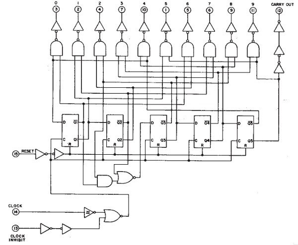 這可能還不清楚,但是如果您看一下CD4017 IC的內(nèi)部結(jié)構(gòu),就會發(fā)現(xiàn)它實際上是使用與門,或非門,反相器,觸發(fā)器和緩沖器構(gòu)造的。
